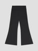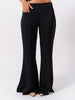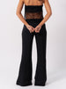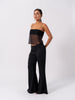 BLACK SATIN TROUSERS WITH A LIGHT, FLUID DRAPE, SLIGHTLY FITTED THROUGH THE THIGHS AND FLARING INTO A SUBTLE BELL SHAPE DOWN TO THE ANKLES. DESIGNED WITH A WIDE WAISTBAND TO ENHANCE THE SILHOUETTE AND A SMALL FRONT POCKET DETAIL.