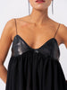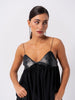 THE LILY BURGUNDY TOP FEATURES A TRIANGLE SILHOUETTE TOP IN VEGAN LEATHER AND CHIFFON WIDE BODY, IT ALSO INCLUDES VERY THIN STRAPS.