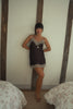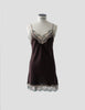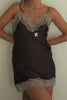 CHOCOLATE BROWN SATIN MINI SLIP DRESS WITH EXTRA-THIN RAT-TAIL STRAPS AND DELICATE WIDE FRENCH LACE DETAILS IN SOFT CREAM AND PALE BLUE TONES. A LUXURIOUSLY FEMININE PIECE WITH A SUBTLE, SENSUAL CHARM.